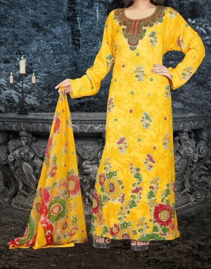 Robe orientale d'été légère à col rond à strasses, avec motifs fleuris, manches courtes assorti d'un foulard. Tissu à base de polyester léger, doux et agréable à mettre.