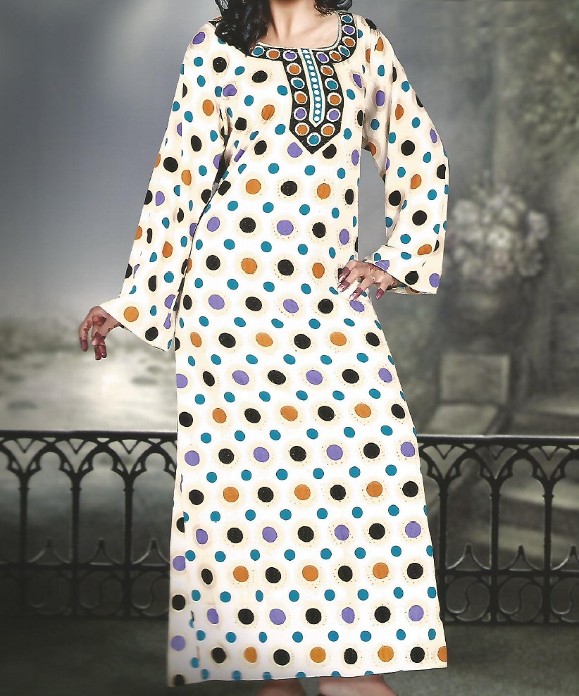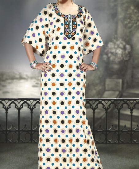Robe orientale d'été légère à col rond à strasses, beige avec motifs ronds de couleurs variés, manches courtes assorti d'un foulard. Tissu à base de polyester léger, doux et agréable à mettre.