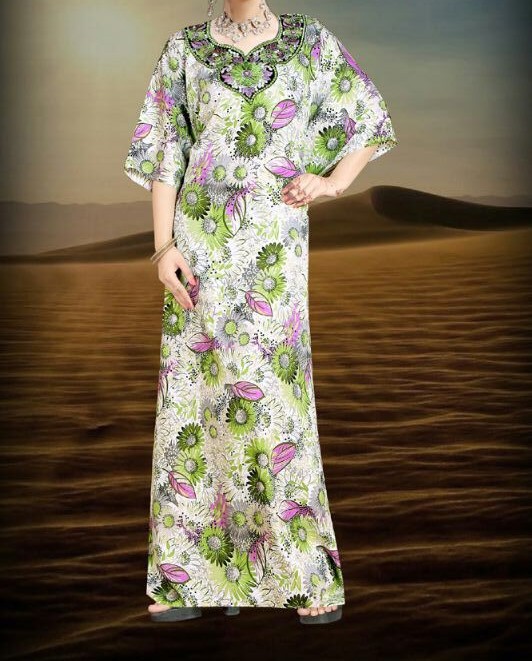 Robe orientale d'été légère à col V avec broderies et strass, motifs fleuris, manches courtes. Tissu à base de polyester léger, doux et agréable à mettre.