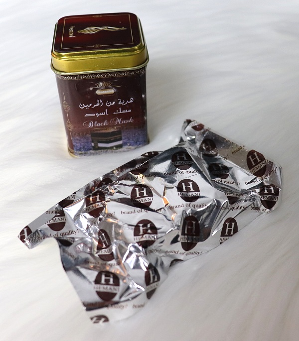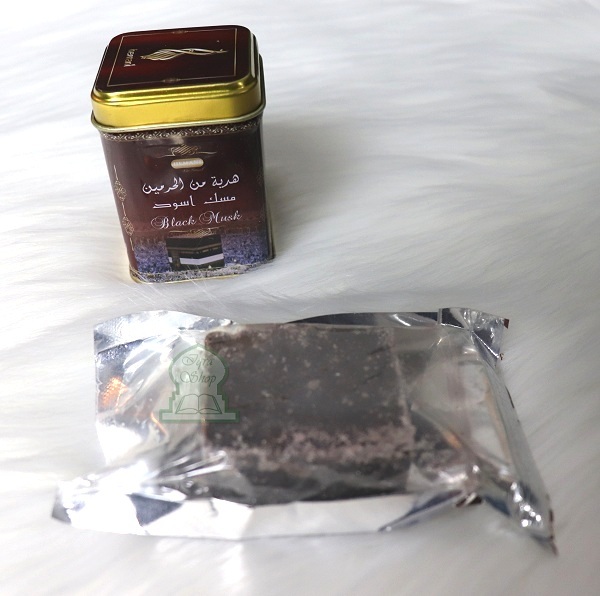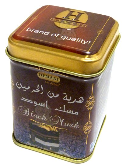 Boite métallique contenant du musc noirs solide (en morceau). Le parfum musc noir est un parfum solide, produit à base d'huiles essentielles sans alcool.