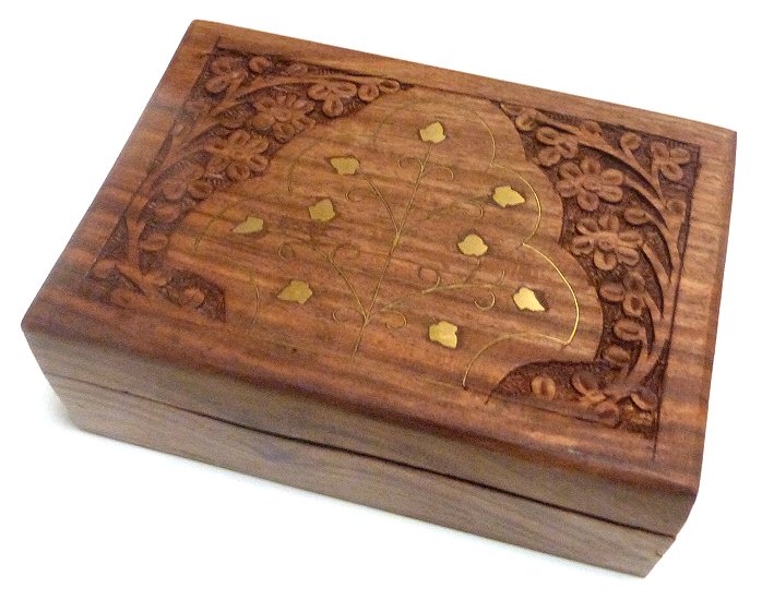 Coffret artisanal boite à bijoux en bois sculpté avec motifs floraux et métal doré - REF. 16856 (12.90 €)