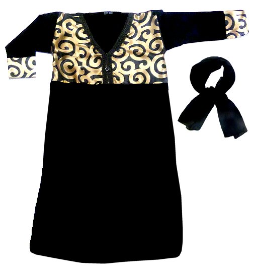 Abaya noire avec motifs dorés et écharpe noire assortie. (taille en cm approximative)