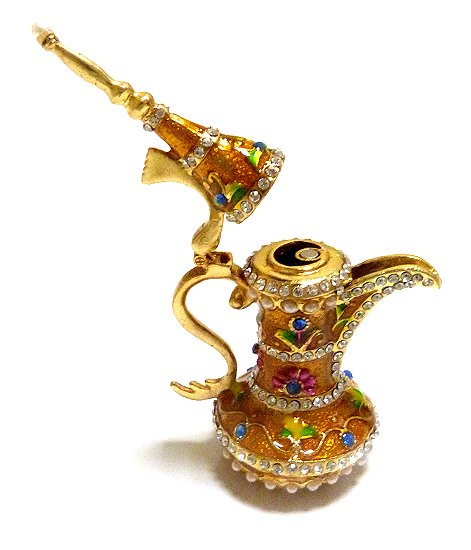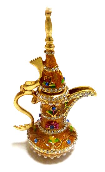 Théière, peinte en dorée, parsemée de strass argentés et colorés dont les bords sont dorés.