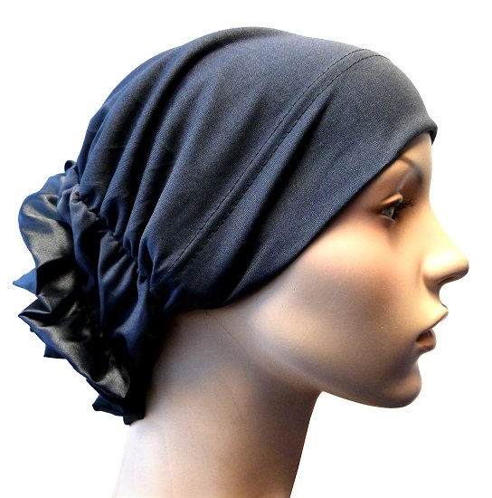 Bonnet gris anthracite avec fleur décorative sur l'arrière. En une seule pièce.