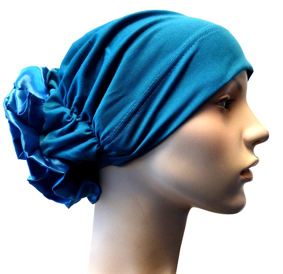 Bonnet bleu-vert avec fleur décorative sur l'arrière. En une seule pièce.