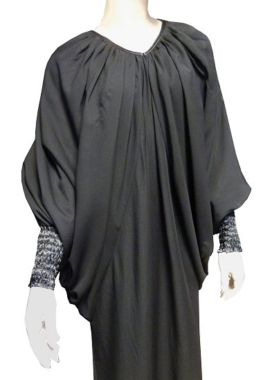Robe confortable et habillée . Col en V satiné, manches amples resserrées aux poignets par une bande élastique froncée et satinée. Tissu léger style "organza" accompagné d'une doublure. Coupe papillon en haut et droite au niveau des hanches.
