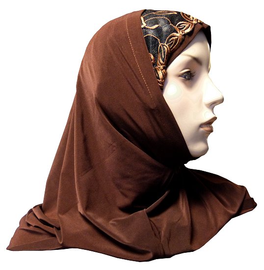 Hijab 2 pièces marron chocolat dont le bonnet est orné d'une dentelle à motifs fleuris marron clair. Matière agréable au toucher et à porter.