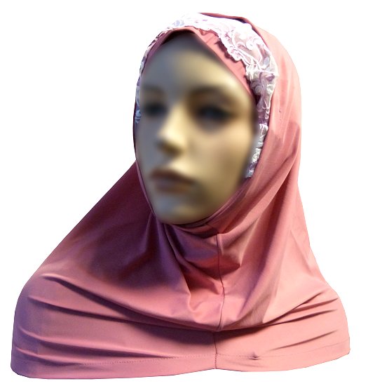 Très beau hijab 2 pièces rose avec bonnet dentelle fleurie et plissée.