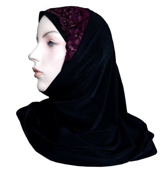 Hijab deux pièces de couleur noire avec dentelle motifs fleuris grenat.