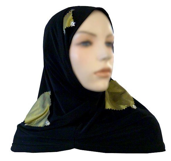 Très beau hijab 2 pièces noir avec carreaux vert olive satinés et strass.