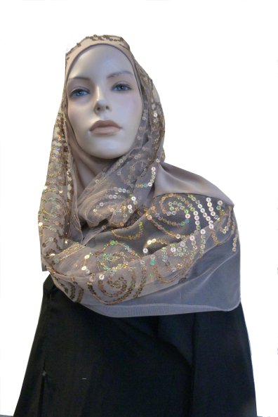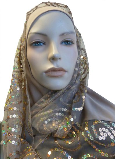 Foulard hijab 1 pièce une partie matière élastique de couleur taupe et une partie légère à positionner par dessus en dentelles à motifs fleuris et strass.