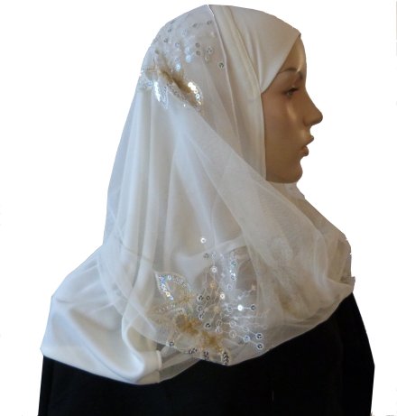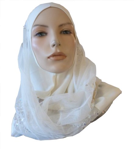 Foulard hijab 1 pièce une partie matière élastique de couleur blanc cassé et une partie légère à positionner par dessus en dentelles à motifs fleuris et strass.