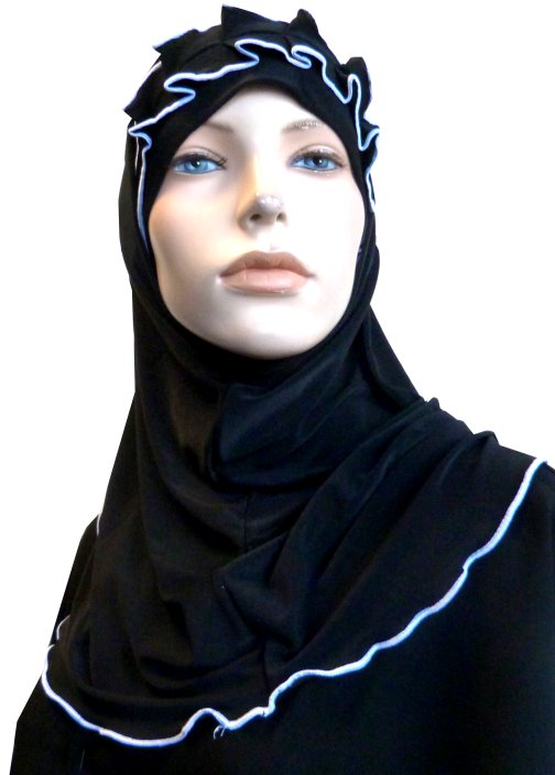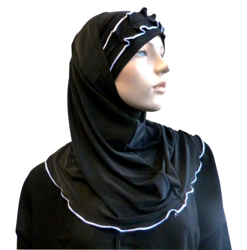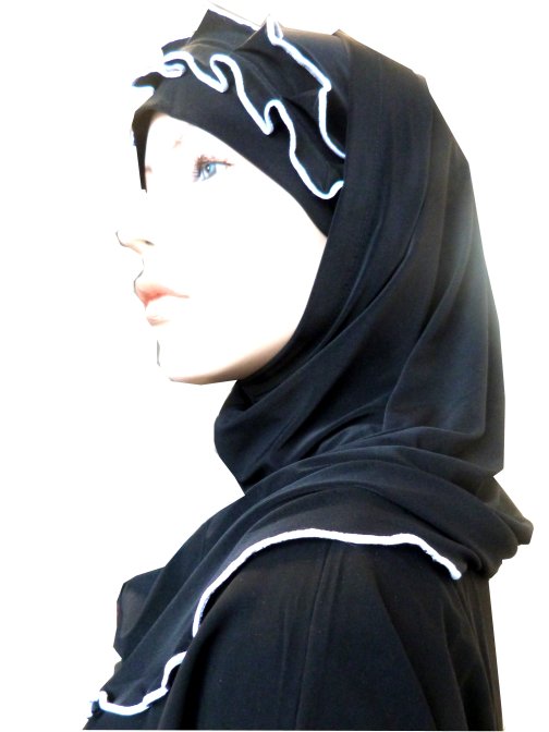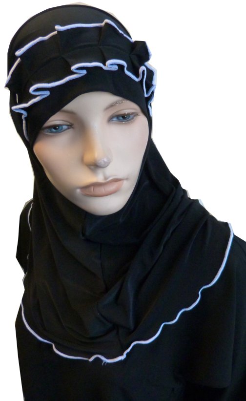 Très beau hijab 2 pièces noir avec ruban froncé piqué blanc.