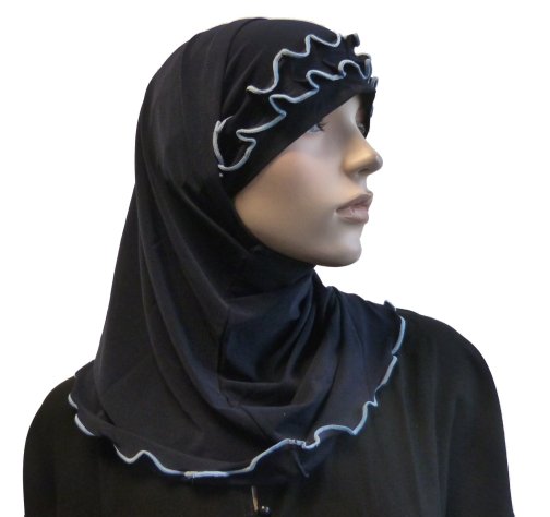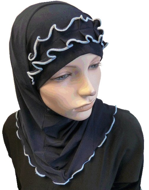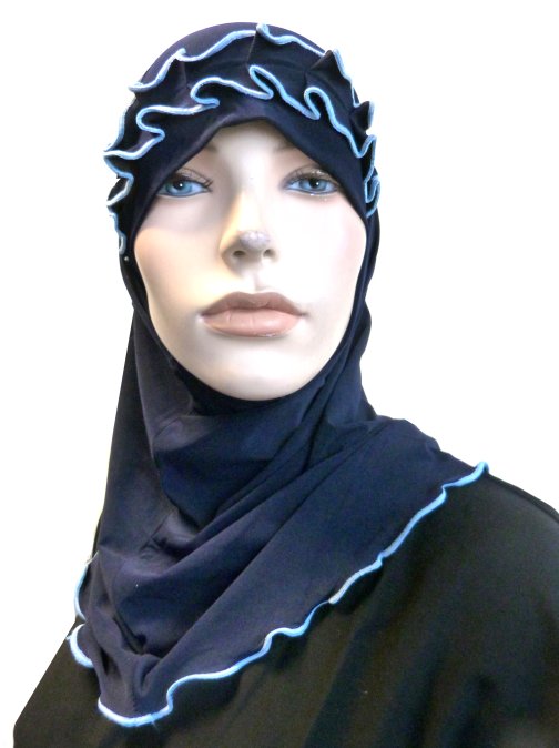 Très beau hijab 2 pièces bleu marine avec ruban froncé piqué bleu ciel.