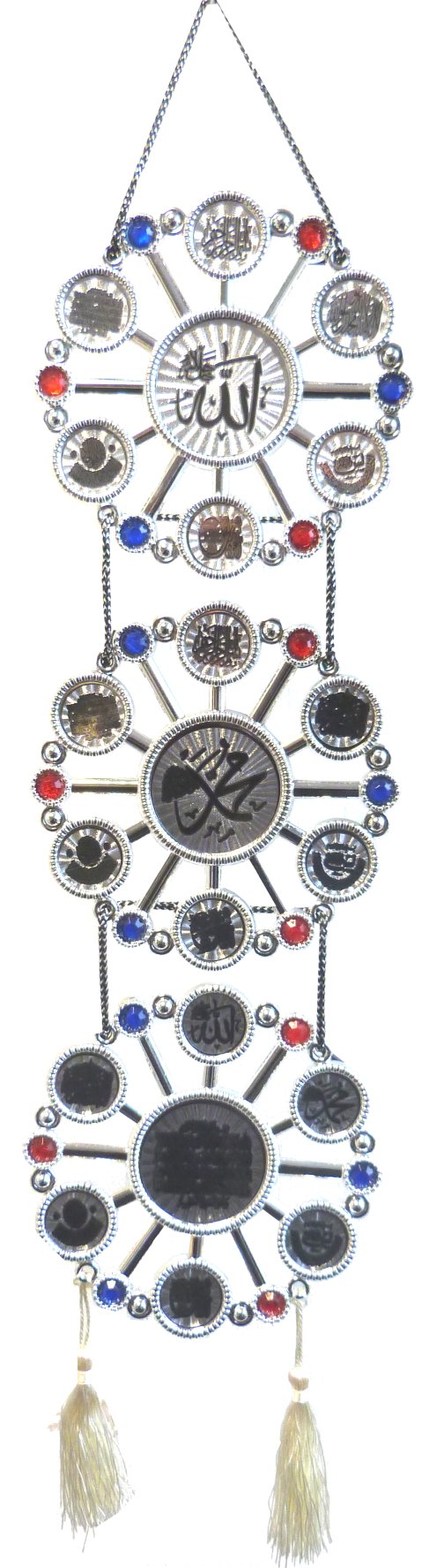 Décoration islamique au style moderne, elle s'accroche au mur pour embellir votre intérieur. Elle se compose de trois parties dont le pourtour est garni de petits diamants rouges et bleus. La première partie porte l'inscription "Allah", la deuxième l'inscription "Muhamed", alors que la troisième renferme le Verset du Trône qui vous garantit la protection divine une fois récité.