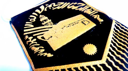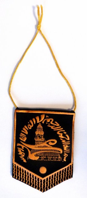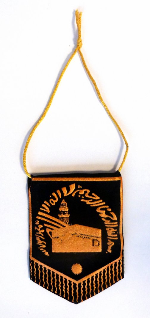 Pendentif avec dorure sur velours. Allah sur une face et Mohamed sur l'autre, ces 2 noms sur fond de mosquée avec inscription bismillahi rahimani rahimi et la chahada (attestation de foi musulmane).