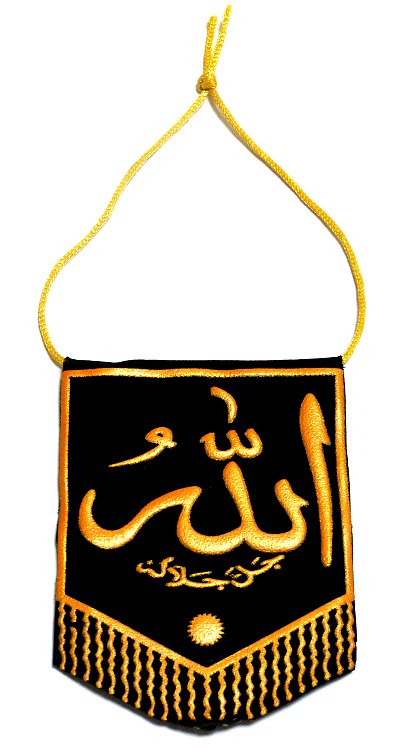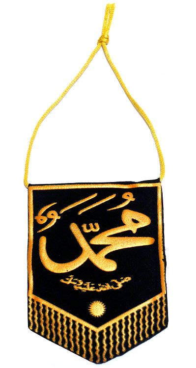 Pendentif recouvert de velours noir avec écritures dorées, sur une face le Nom "Allah" (Jalla Jalalouh) et sur l'autre la calligraphie du nom du Prophète "Muhammad" (SAW).