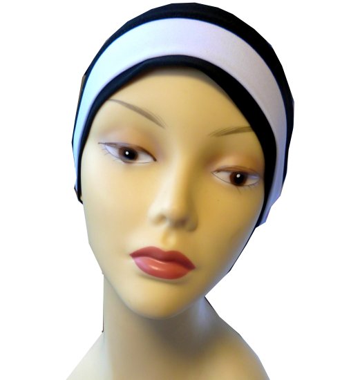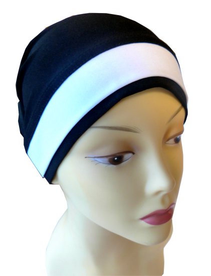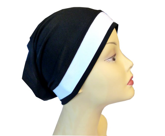 Bonnet noir extensible agrémenté d'une bande de tissu blanche à l'avant pour habiller vos hijabs avec style et modestie 24 cm.