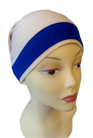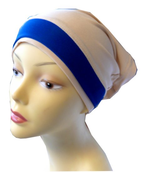 Bonnet beige extensible agrémenté d'une bande de tissu bleu à l'avant pour habiller vos hijabs avec style et modestie 24 cm.