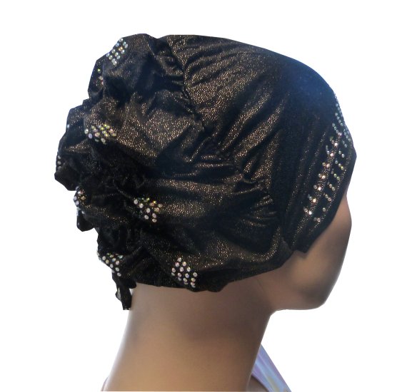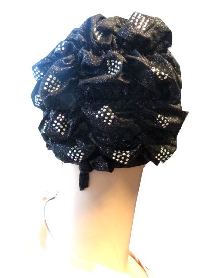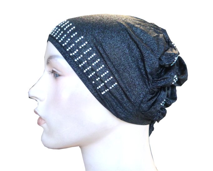 Bonnet noir pailleté avec strass sur le devant ainsi que sur la coiffe.