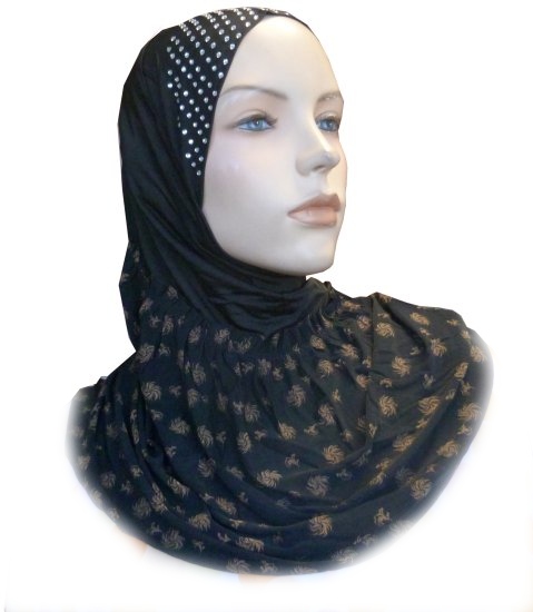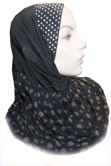 Hijab 1 pièce noir perlé sur le bonnet avec motifs cuivrés.