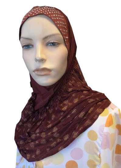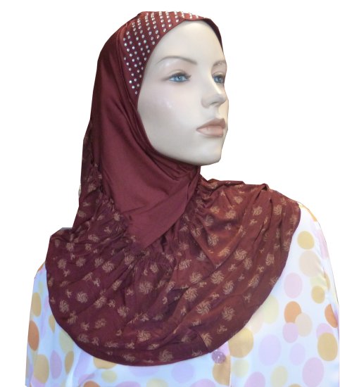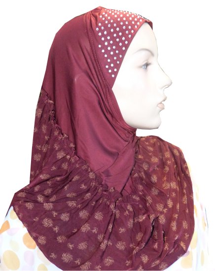 Hijab 1 pièce bordeaux perlé sur le bonnet avec motifs cuivrés.