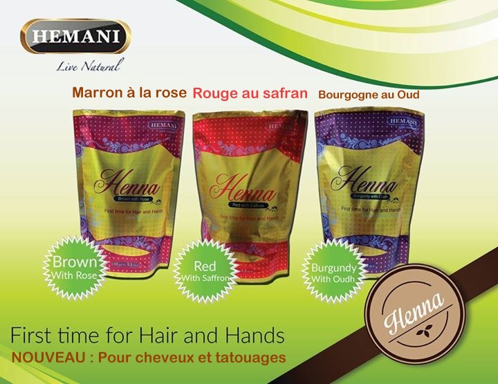 Hennés de la marque Hemani utilisables aussi bien pour la teinte des cheveux que pour les tatouages sur les mains et les pieds.