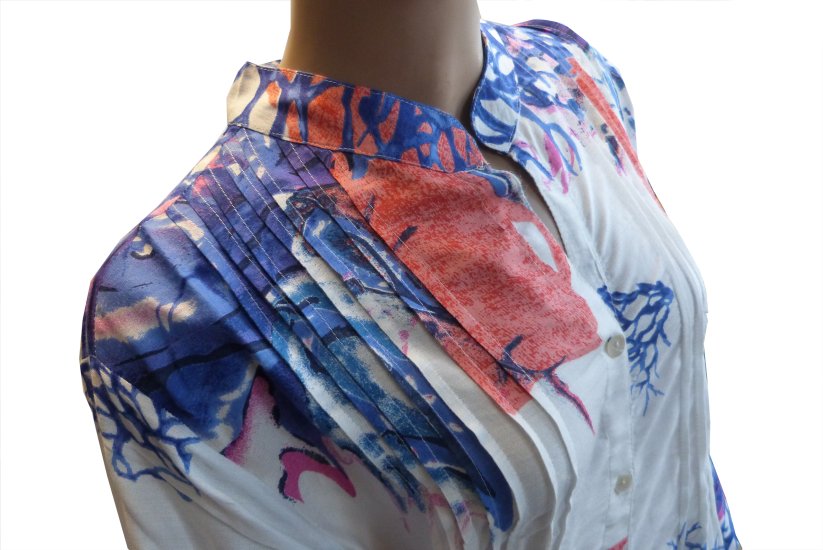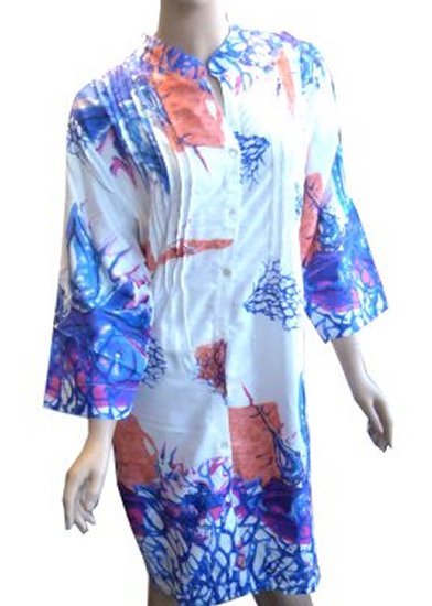 Belle tunique blanche avec motifs bleu, fuchia et corail.