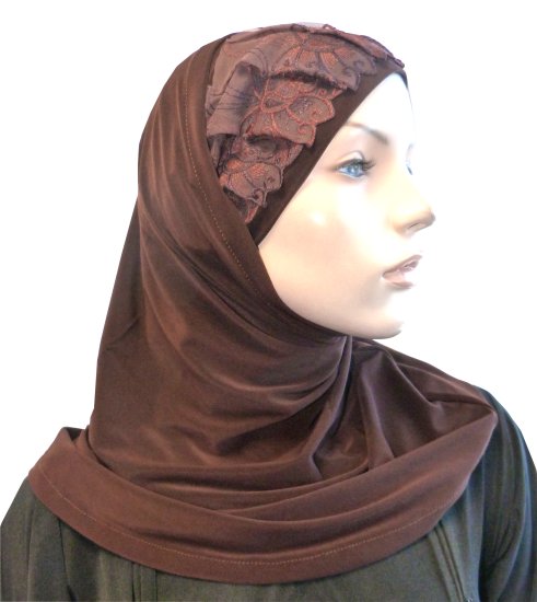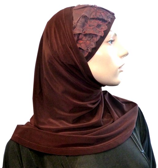Hijab 2 pièces marron foncé dont le bonnet est orné d'une dentelle à motifs fleuris marron clair.