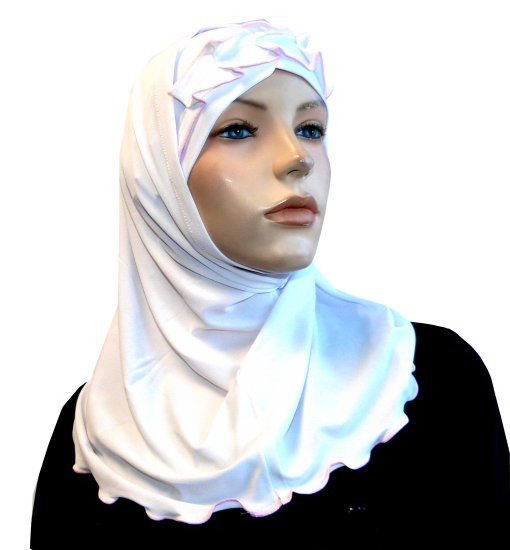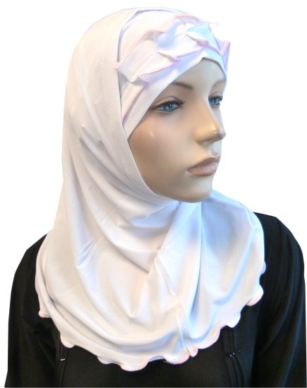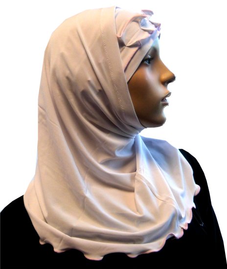 Très beau hijab 2 pièces blanc avec ruban froncé piqué rose clair.