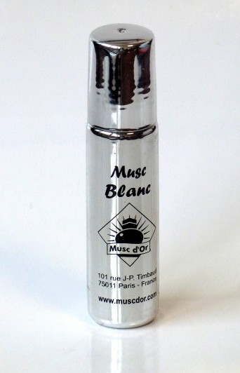Parfum concentré sans alcool Musc d'Or "Musc Blanc" (8 ml en édition de luxe). Parfum mixte (pour hommes et femmes). Jolie bouteille argentée.