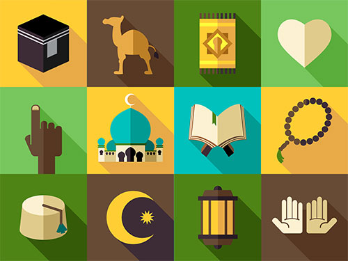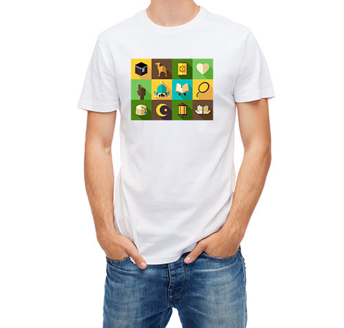 T-Shirt moderne personnalisable, avec en illustration des icônes sur les thèmes de l'Islam.