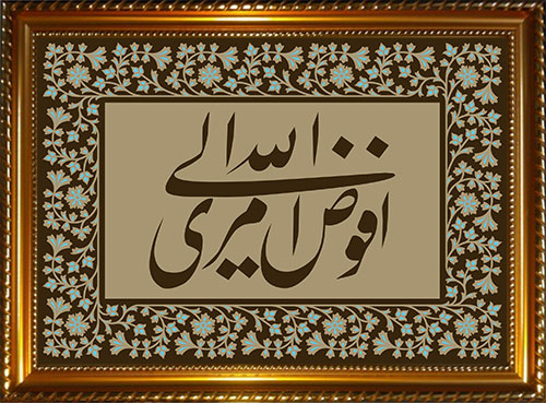 Tableau avec une calligraphie en style diwani de la formule : "Je m'en remet à Allâh" (أفوض أمري إلى الله).