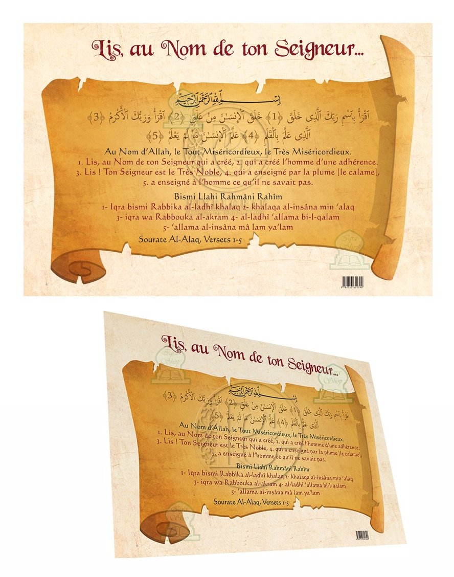 Ce poster, façon parchemin, met en valeur les 5 premiers versets de la Sourate Al-Alaq, en arabe, en français et en transcription phonétique.