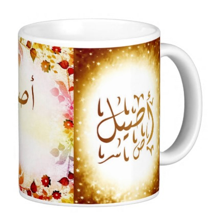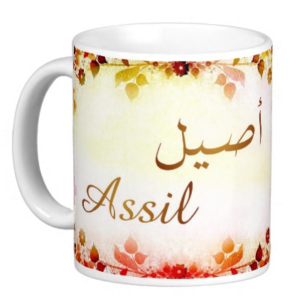 Mug avec le prénom "Assil" écrit en français, en arabe (أصيل) et calligraphié de façon artistique en arabe sur la partie droite.