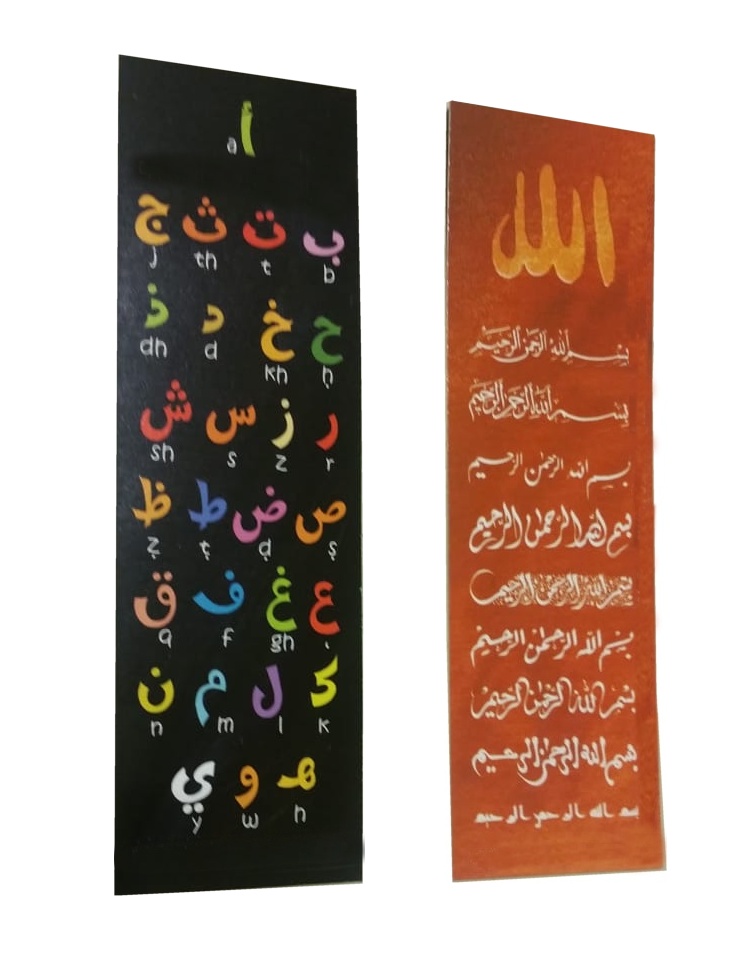 Petit marque page de l'alphabet arabe multicolore sur fond noir sur une face et Basmala sur l'autre déclinée sous 9 calligraphies de différents styles calligraphiques.