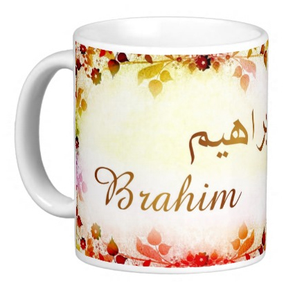 Mug avec le prénom "Brahim" écrit en français, en arabe (براهيم) et calligraphié de façon artistique en arabe sur la partie droite.