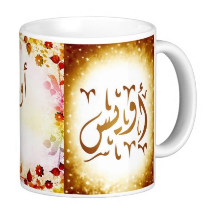 Mug avec le prénom "Ouweisse" écrit en français, en arabe (أويس) et calligraphié de façon artistique en arabe sur la partie droite.