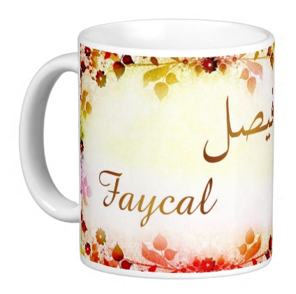 Mug avec le prénom "Faycal" écrit en français, en arabe (فيصل) et calligraphié de façon artistique en arabe sur la partie droite.