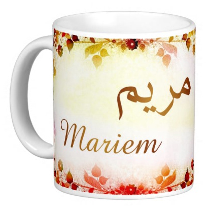 Mug avec le prénom "Mariem" écrit en français, en arabe (مريم) et calligraphié de façon artistique en arabe sur la partie droite.