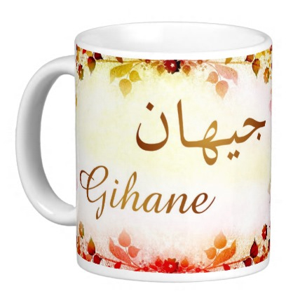 Mug avec le prénom "Gihane" écrit en français, en arabe (جيهان) et calligraphié de façon artistique en arabe sur la partie droite.