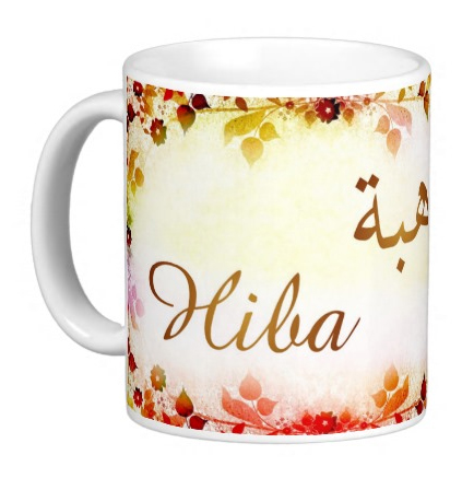Mug avec le prénom "Hiba" écrit en français, en arabe (هبة) et calligraphié de façon artistique en arabe sur la partie droite.