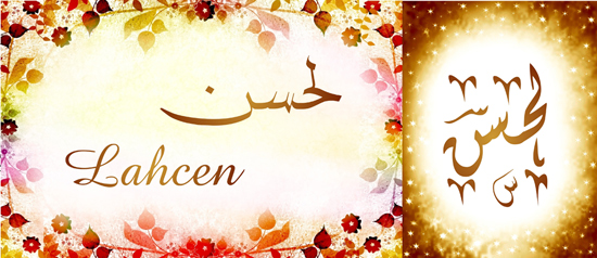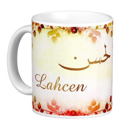 Mug avec le prénom "Lahcen" écrit en français, en arabe (لحسن) et calligraphié de façon artistique en arabe sur la partie droite.