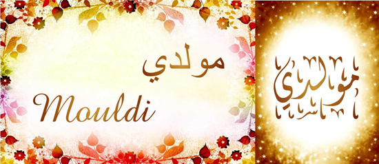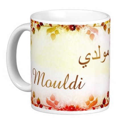 Mug avec le prénom "Mouldi" écrit en français, en arabe (مولدي) et calligraphié de façon artistique en arabe sur la partie droite.