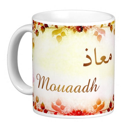 Mug avec le prénom "Mouaadh" écrit en français, en arabe (معاذ) et calligraphié de façon artistique en arabe sur la partie droite.
