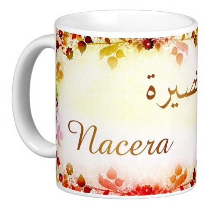 Mug avec le prénom "Nacera" écrit en français, en arabe (نصيرة) et calligraphié de façon artistique en arabe sur la partie droite.