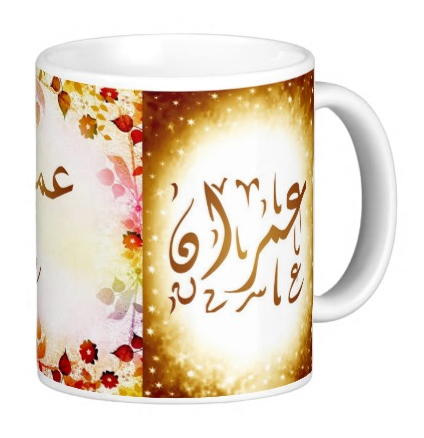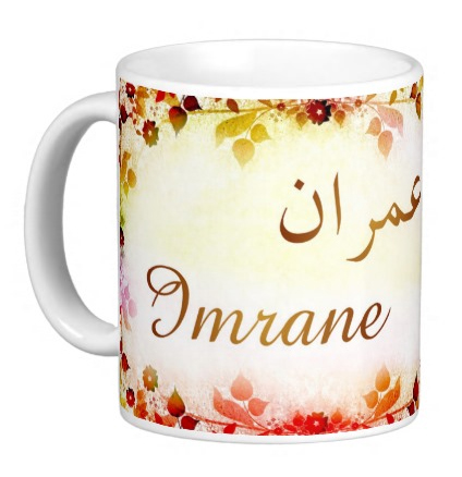 Mug avec le prénom "Imrane" écrit en français, en arabe (عمران) et calligraphié de façon artistique en arabe sur la partie droite.