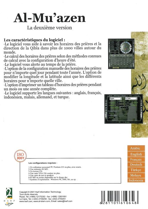 Logiciel d’apparence distinguée, conçu pour déterminer les horaires exacts de l'accomplissement des prières prescrites, dans les quatre coins du monde. Il montre également la direction de La Mecque (la qibla) dans n'importe quel pays, grâce au calcul des longitudes et des latitudes de plus de 1000 villes à travers le monde.