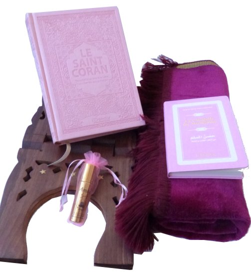 Coffret/Pack cadeau prière pour femme : Tapis rose, Coran luxe rose, Porte Coran, Diffuseur de parfums, parfum Musc d'Or et chapelet perles - REF. 21951 (45.00 €)