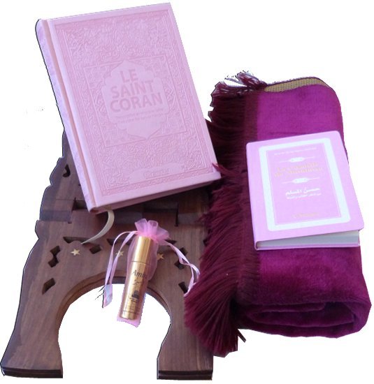 Pack Cadeau Mauve : Le Noble Coran avec couleurs Arc-en-ciel (Rainbow), La Citadelle du Musulman, Le Prophète Muhammad (SAW) et la femme, Tapis uni en velours, Diffuseur de parfum (assortis) - REF. 24134 (39.90 €) - En Promotion à 35.00 €